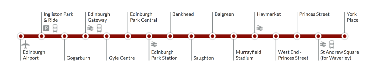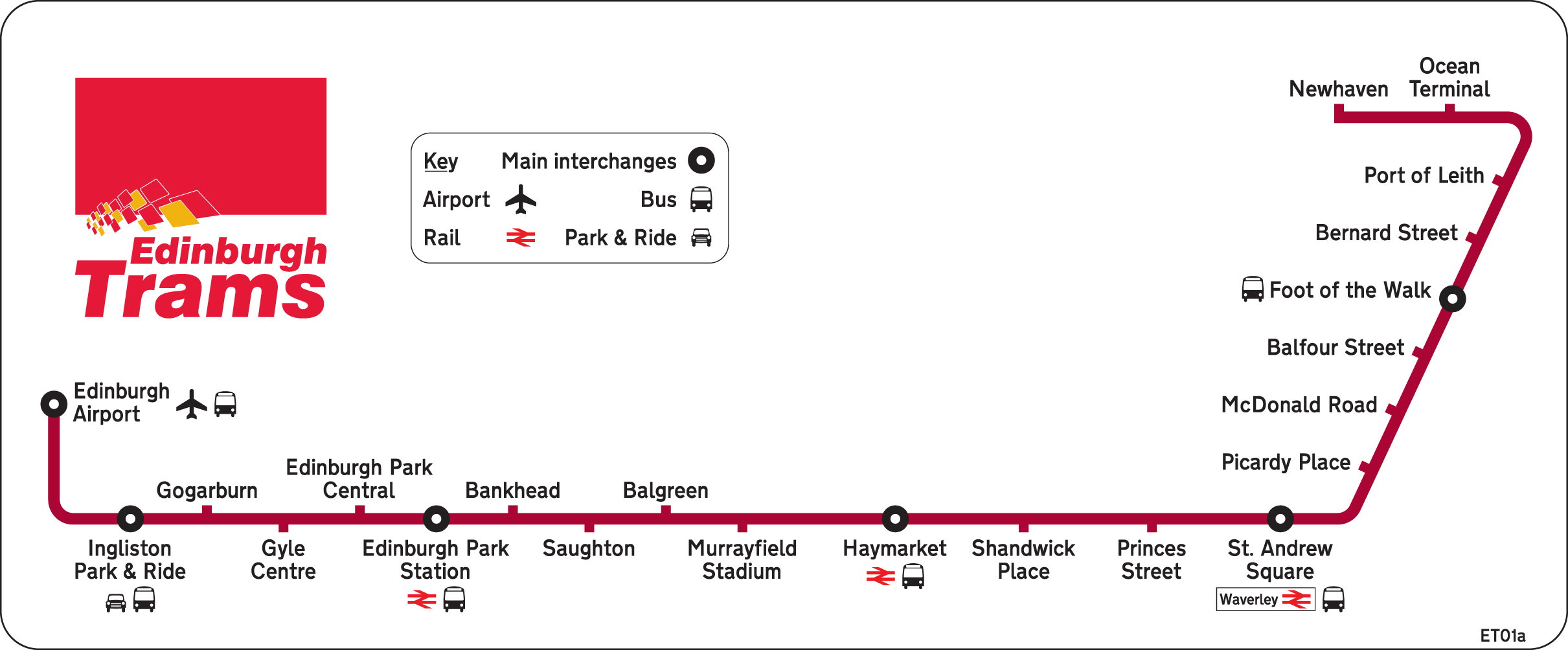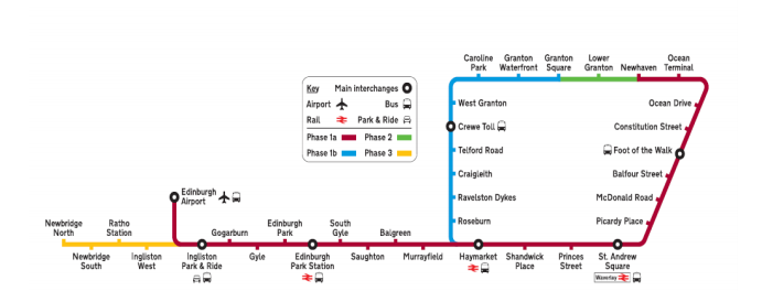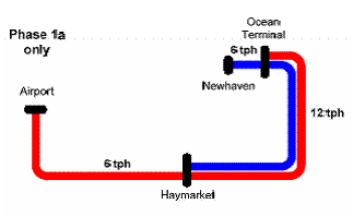 ![]() Tram plans: Phases 1 - 3 ![]() 2007 reduced plans: Phase 1a only - Airport to Leith ![]() Tram route: As delivered ![]() |