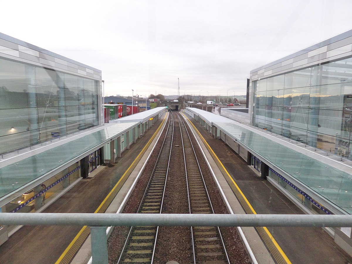![]() Stewart Stevenson MSP ![]() 2007 proposals: Almond chord and Edinburgh Gateway ![]() Edinburgh Gateway station (2016) ![]() ![]() Newbridge junction (spanning M8 motorway) |