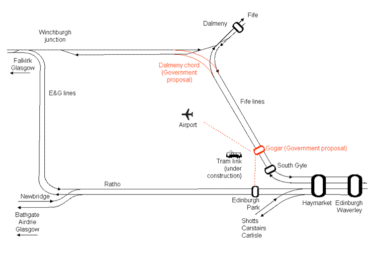 The Minister instead proposed an alternative solution of adding an airport station at Gogar on the Fife railway line. This would provide an interchange with Edinburgh City’s trams for onward travel to the airport. He also said that the Government intends to build a rail link between the Fife and the Edinburgh & Glasgow (E&G) routes – the Almond chord – that would allow E&G trains to stop at the new airport station. (The terminology in 2007 was 'the Dalmeny chord' but that created confusion with the existing rail link between Winchburgh junction and Dalmeny junction which already carries that name so we refer to 'the Almond chord' throughout to refer to the proposed new link.) The layout of the railway lines in 2007 and the assumed configuration of the proposed Edinburgh Gateway station and Almond chord are shown in Figure 1. There were no plans or documentation available in the public domain in 2007 that provided details or layouts of the Government’s proposals. The station at Gogar later came to be named 'Edinburgh Gateway' and serves only the northern two of the four railway tracks that pass through Haymarket and Waverley. Trains to and from Fife use the northern pair of tracks; trains to and from Glasgow, Falkirk and Stirling use the southern pair. Therefore, trains to and from Glasgow that serve Edinburgh Gateway station via the proposed Almond chord would share the northern pair of tracks with Fife trains. The requirement for the Almond chord appears unrelated to Edinburgh Airport. Prior to the Airdrie-Bathgate line being reopened in 2010, four trains per hour (tph) ran from Glasgow Queen Street, via Falkirk and Newbridge Junction to Edinburgh Waverley and a further two tph ran between Dunblane and Edinburgh. Network Rail has since electrified and increased the capacity of the E&G line as part of the EGIP project. With the addition of 4tph from Glasgow via Bathgate and a further 2tph from new services via Cumbernauld, there will be a total of twelve tph to be accommodated on the E&G line through Newbridge junction and Edinburgh Park. The current track configuration cannot cope easily with this traffic. Newbridge junction is a flat junction and it would not be practicable to rebuild it as a grade-separated junction because it spans the M8 motorway, as shown in Figure 2. The initial technical feasibility report on the reopening of the Airdrie-Bathgate line noted (Section 3.1.1) “If EARL should proceed…it would ease the well-known capacity constraints at and east of Newbridge Junction into Haymarket Station.” In the absence of EARL (or either EISL proposal), the Almond chord is required to provide the opportunity to divert some of the trains from Glasgow (via Falkirk) onto the Fife lines. The Fife lines carry only five or six tph and Network Rail has upgraded the signalling to improve their capacity. Diverting some of the Glasgow (via Falkirk) trains onto the Fife lines via Dalmeny would balance the loading on the E&G and the Fife lines more evenly and provide operational flexibility to cope with disruption to services. It would enable more trains to be timetabled to stop at Edinburgh Park. It is possible that the opening of the Almond chord would reduce the number of trains that could stop at Edinburgh Gateway because the tracks through that station would then be required by a greater density of traffic and trains that stop would delay following non-stopping trains. All trains that use the Fife lines will pass through Edinburgh Gateway, regardless of whether they are stopping there. This is a different arrangement from that which was proposed for EARL, in which an extra set of tracks would have been provided forming a loop that would be used only by trains stopping at the airport station. EARL proposed only two platforms and proposed a timetable that allowed only about half the trains from the Fife lines and half from the E&G lines to be diverted through the EARL loop, because the EARL station’s two platforms could not have coped with all the trains that travel west from the four platforms at Haymarket. Likewise, Edinburgh Gateway could never have more than about half the trains heading west from Haymarket passing through it, and fewer if many trains are to stop at Edinburgh Gateway. Because all Fife-bound trains must pass through Edinburgh Gateway, this will limit the number of trains that can use the proposed Almond chord. It is not obvious how many trains per hour could stop at Edinburgh Gateway but it appears unlikely that frequent services can be offered to any part of Scotland that is not served by a rail line through Fife. With the Almond chord operational, the arrangements at Edinburgh Gateway and Edinburgh Park would be complex for passengers, especially infrequent travellers or tourists arriving at the airport. For example, it would be complex to advise passengers travelling from the airport where they should alight from the tram to board a train to Falkirk. The next train may leave from either Edinburgh Gateway or Edinburgh Park. The station at Edinburgh Gateway directly benefits only passengers travelling from Fife, who are able to transfer to a tram at Edinburgh Gateway, rather than at Haymarket. It is unlikely to provide more than two trains per hour for passengers travelling to or from Glasgow. It will be unable to serve the Airdrie – Bathgate line to Glasgow. The Almond chord would offer benefits to the rail network but not directly to passengers travelling to or from Edinburgh Airport.